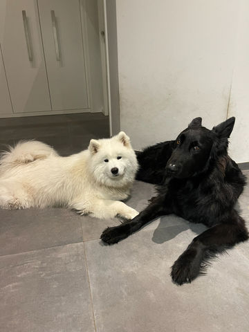 Blou ist ein sehr freundlicher und intelligenter altdeutscher Schäferhund. Im Haus ist er rassetypisch sehr wachsam, möchte seine Familie vor Fremden beschützen. Er braucht jedoch altersbedingt auch viel Ruhe. Blou ist Menschen gegenüber sehr freundlich und vorsichtig eingestellt. Das macht ihn zu einem Hund, der absolut fantastisch im Umgang mit Kindern ist. Im Garten dreht er im gemeinsamen Spiel mit Daisy trotz seines Alters noch ordentlich auf, und tobt mit ihr. Allgemein hat Blou es immer geliebt, mit anderen Hunden zu spielen. Durch seine große, schwarze Erscheinung haben die meisten Hundehalter jedoch Vorurteile, weshalb es ihm schwerfällt, neue Freunde zu finden. Mit seinen Hundefreunden wie auch sonst zeigt sich Blou jedoch sehr charakterstark, freundlich und verspielt. Blou lässt nahezu alles mit sich machen, weshalb Daisy schnell die Rolle des Hunderudelführers übernehmen konnte.